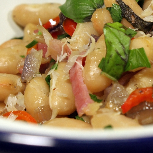The flavours in this warm salad – garlic, basil, onion, proscuitto and a kiss of chilli are absolute winners with the creamy cannelini beans. With some simply grilled meat, a fresh green salad and jacket potatoes, you have a complete meal that’s delicious, healthy, and has a wonderful mix of contrasting textures and flavours.