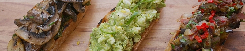 I wanted to celebrate wonderful flavours in these three bruschetta toppings. They feature mushrooms, avocado and eggplant, with other bold flavours like basil, lemon, fresh red chilli and cumin seeds. Each recipe will make 4 – 6 bruschetta generously topped, depending on the size of your bread. I’d suggest a chewy sourdough or ciabatta. For a party, or for lunch; mixed and matched or just one type; they are a simple, healthy and very delicious way to eat the best of summer. It is a wonderful thing to harvest vegetables and herbs from your own garden, come inside, cook them, and then share with those you love. Even on a scorching summer’s day it was a joyful experience to prepare them. At our place the bruschetta were a hit with all, and even a former mushroom avoider gave me a thumbs up.