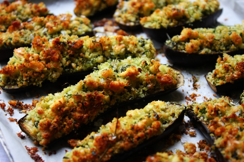 Eggplants are a favourite of mine and I find their deep, shiny colour, complex flavour and silky texture quite compelling. For two summers I have grown eggplants in my vegetable patch and they have yielded sensationally. The fruit of the variety I grow is generally long and slender, although sometimes a big, round eggplant appears. They are not at all bitter so preparing and cooking them is very simple. Topped with breadcrumbs, herbs, olive oil, garlic and parmesan, they make a great starter or component of an antipasto selection. You could make this recipe with the typical rounder eggplant variety. Just slice horizontally and then pile on the topping.